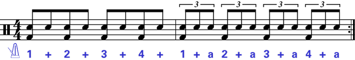 The following beat uses triplets, played by the right hand. Once again, remember to keep the notes even and the sound consistent.